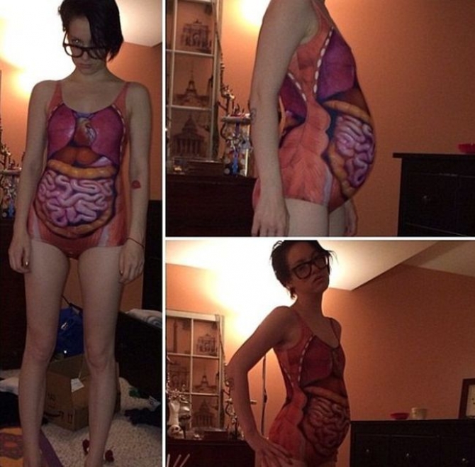 Costumul este unul inedit, însă nerecomandat celor cu stomacul sensibil. El înfăţişează structura internă a omului, felul în care sunt aşezate organele în organism. Cu toate că nu e potrivit pentru toate femeile, obiectul vestimentar va întoarce cu siguranţă multe capete.